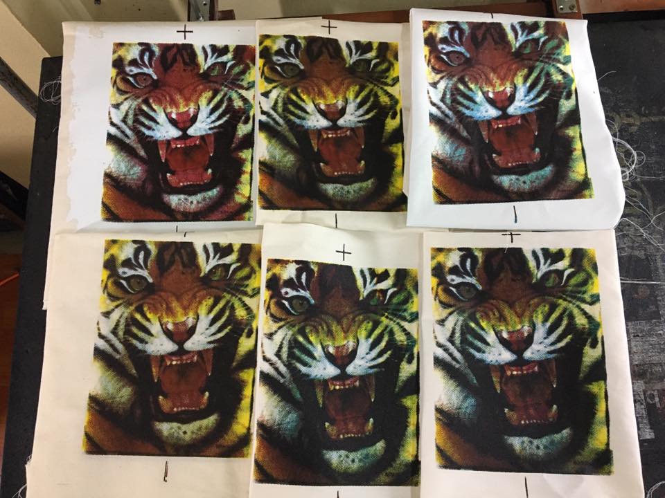 จากภาพตัวอย่างเป็นลักษณะของการเทสสีสกรีน สีจม โดยวิธีการ CMYK จำนวน 4 บล็อก 4สี และลองเทสสกรีนโดยสลับสีเพื่อค้นหาว่าเอาสีไหนลงก่อน สีไหนลงในลำดับถัดมา จะเห็นได้ว่าสีหน้าของเสือจะมีความดุดันแตกต่างกันเพราะการสลับการลงสี และเมื่อจับชิ้นงานแล้ว งานสีจะเรียบเนียนไปพร้อมกับเส้นใยผ้า